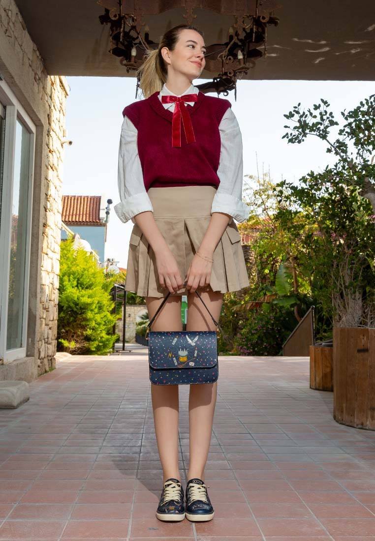 Para un look que combine el diseño de viaje y el colorido pastel de la cartera, te sugiero un conjunto bohemio y casual chic. Combínala con una falda maxi de paneles o patchwork en tonos azules y amarillos (como en la foto), o bien, un vestido chemise blanco de lino o algodón.