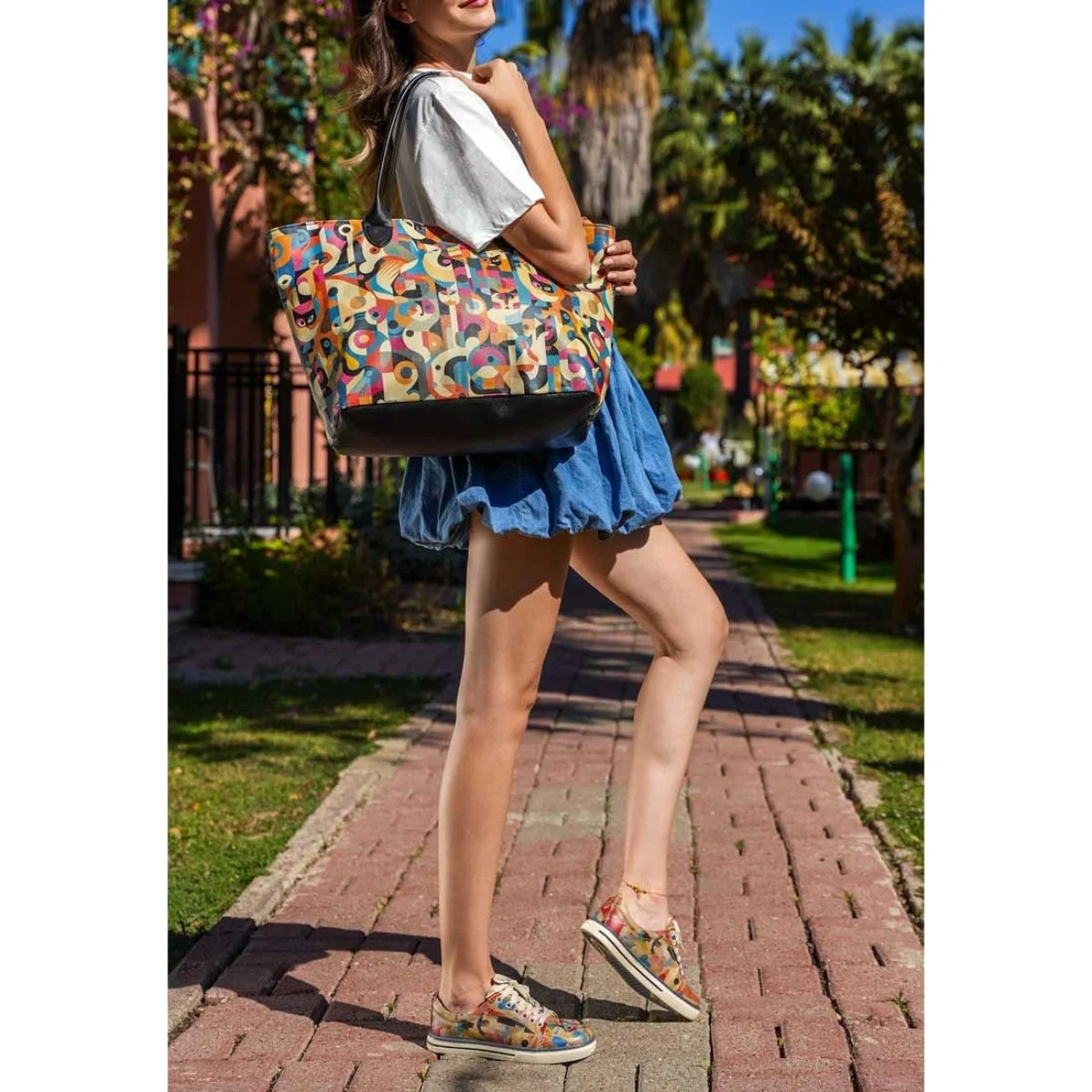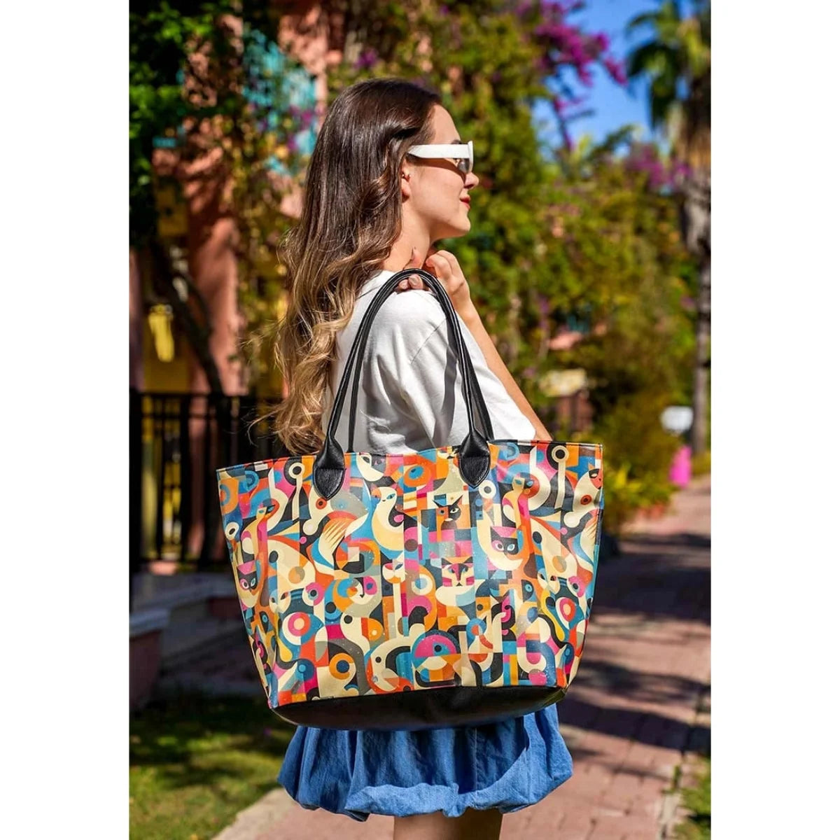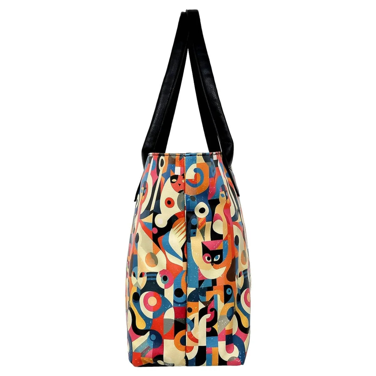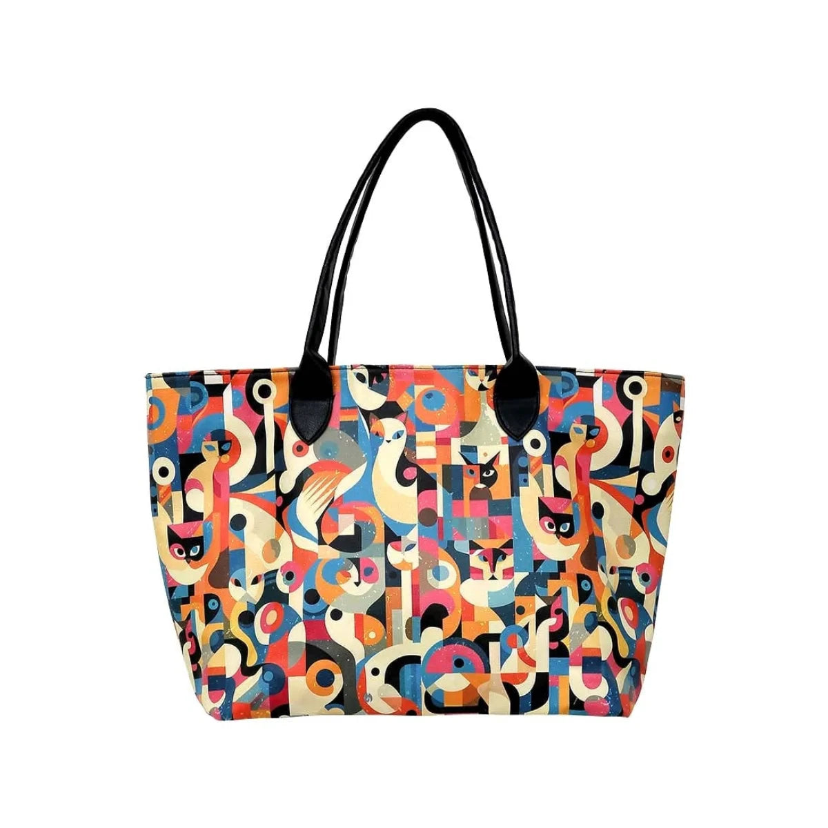 Lleva tu arte, tus valores y tu vida entera! 💖 Este bolso tote es la pieza cruelty-free que estabas buscando. Diseño geométrico multicolor de gatos y siluetas abstractas, hecho con materiales eco-friendly. ¡Espacio oversize y estilo exclusivo garantizado!