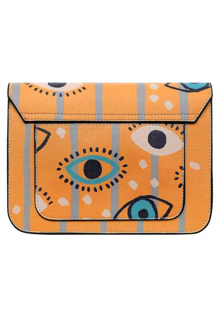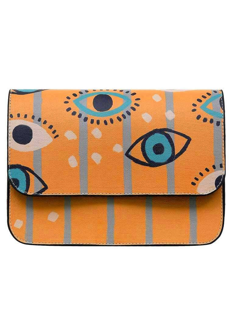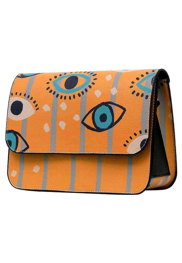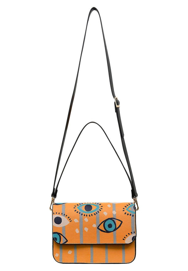 Precio habitual $45.000 .¡Atracción de miradas instantánea! 👀 Esta cartera crossbody es pura energía con su print único y exclusivo de ojos místicos sobre un fondo naranja vibrante y franjas grises, con acentos en turquesa y azul. ¡Es el accesorio statement perfecto para protegerte y brillar! Su diseño es compacto y chic. Y por supuesto, es eco-friendly y está hecha con materiales veganos de alta calidad, para que tu estilo sea tan power como consciente. ¡No la dejes escapar! 🧡