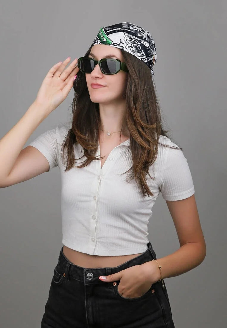 Para un look que permita que el patrón Geocat y el color vibrante sean el centro de atención absoluto, te sugiero un conjunto simple y luminoso. Combínalo con prendas monocromáticas o neutras, como unos shorts de mezclilla (como en la foto) o unos pantalones blancos de lino. En la parte superior, una polera básica en color blanco o negro, o un top que recoja un color del print (ej: turquesa o fucsia).